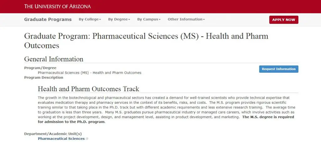 The University of Arizona organizes a Master of Science program in Pharmaceutical Sciences with a major focus on Health and Pharm Outcomes that take students into a rigorous scientific training and education program, that provides them a complete knowledge on medication therapy and pharmaceutical services. A course that is dependent on extensive research, helps students expand their knowledge and acquire skills necessary for career development in the pharmaceutical industry.