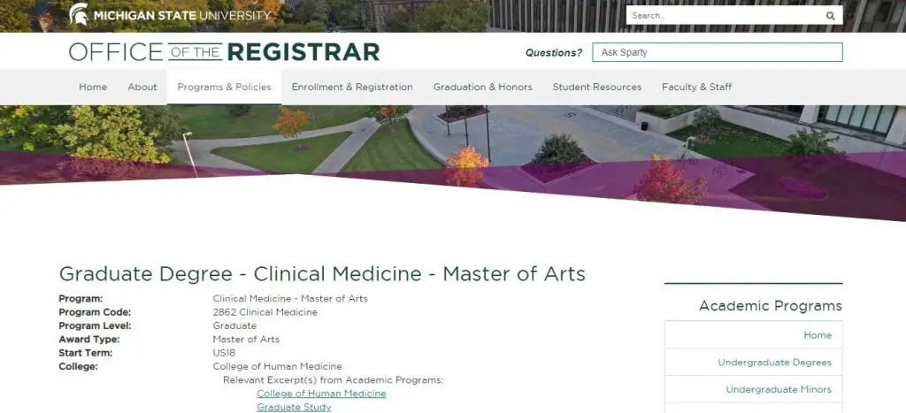 Studying Master of Arts in Clinical Medicine from Michigan State University is one of the best courses students can opt for after completing their bachelor’s degree in Pharmacy. The Clinical Medicine program focuses on basic and clinical sciences and provides an opportunity for students to develop skills in patient contact and care.