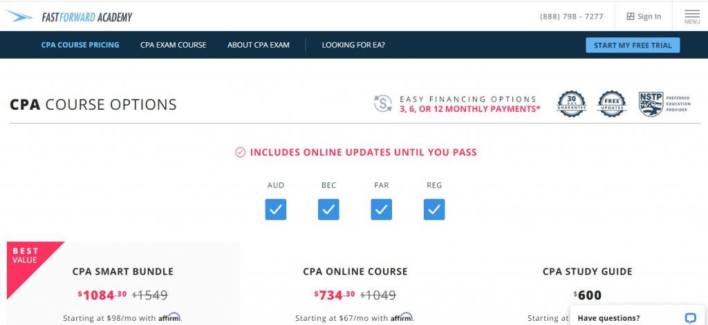 Fast Forward Academy CPA Exam Review is the only course you need for the most important exam of your career. Patented technology, expert instruction, and unparalleled support make it easier to learn and easier to succeed. Prepare to pass with the best-valued course in CPA Exam Review, thousands of study questions, comprehensive textbooks, video lectures, practices exams & more. One-click smart learning helps you focus on the right subjects and Academic & Community support when you need it most. Also, in this course, you can get easy financing options with three, six, or twelve monthly payments.