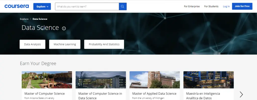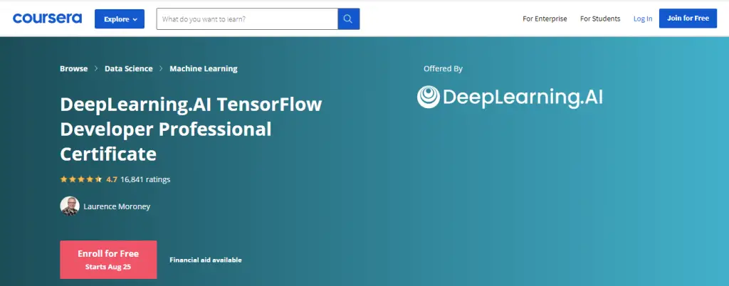 Offered by Deep Learning.AI, this course has a lot of credibility. Get ready to become a machine learning expert. This is one of the popular courses with more than 600000 students. This course is not applicable for beginners since it is necessary to know the basic python programming language. It will take approximately 5 months to complete this program.