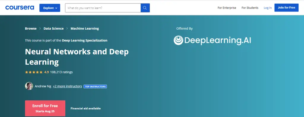 With over 1,70000 students, Machine Learning Specialization is a great program with a lot of guided information. It is a long program which can be completed within 7 months if you study this course for 3 hours per week. You will not only stick to deep learning, but you will also get a general idea of ML subjects.