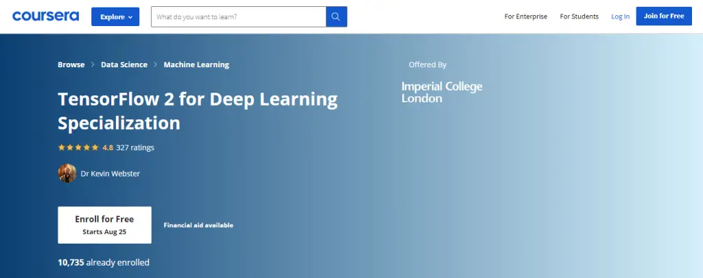 The TensorFlow 2 framework is very popular for deep learning. This course is for professionals, ML researchers, and even students. This is a long step-by-step program since it has a duration of 4 months to complete. It can only be completed in 4 months if you learn the program at a pace of 7 hours per week.