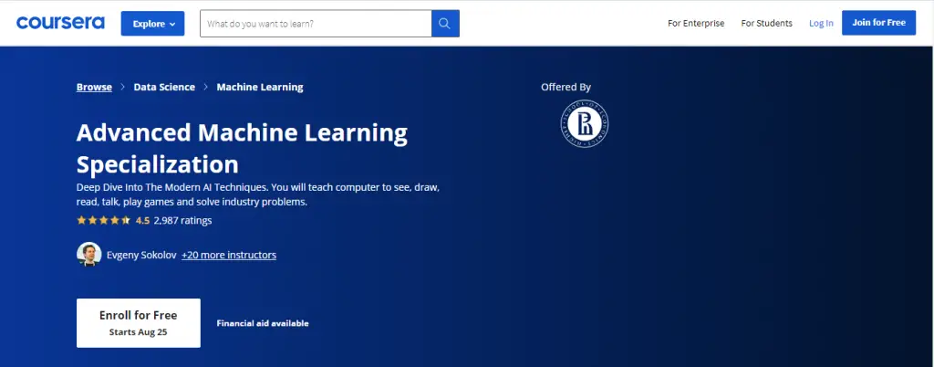 The course is offered by HSE University which is one of the top-class universities in Russia. the course can be completed in a 10 month period and mind you, this course is only applicable for advanced AI learners. It is designed for individuals who are already in the industry. This specialization gives an introduction to deep learning, reinforcement learning, natural language understanding, computer vision, and Bayesian methods.