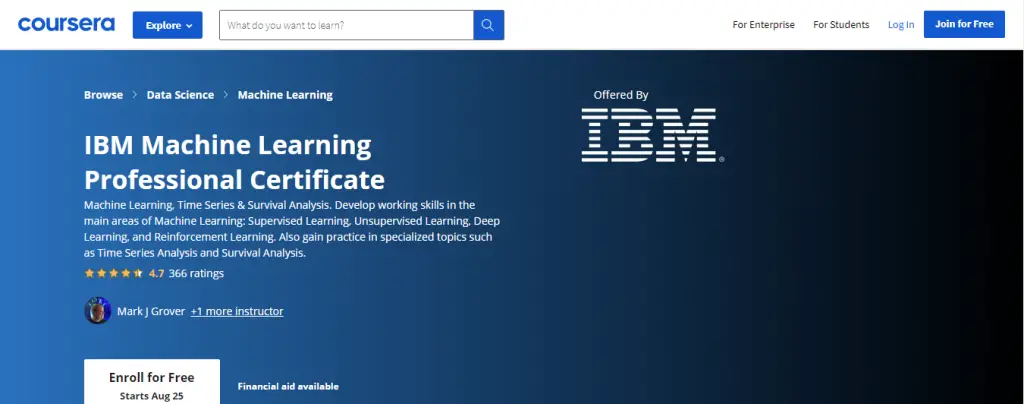 Offered by IBM, this course is highly recommended. This course is tailor-made for students who are looking to develop a career in machine learning. Starting from Unsupervised Learning, Supervised Learning, Deep Learning, to Reinforcement Learning, you will learn every single ML subject.