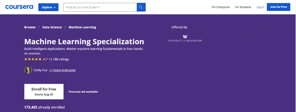 The program is offered by leading researchers from the University of Washington. The lead instructor of this program is Emily Fox. She is an Amazon Professor of Machine Learning. The credibility of the course is pretty high since the certification is offered by the University of Washington. You will also cover the subjects in ML-like Prediction, Classification, Clustering, and Information Retrieval.