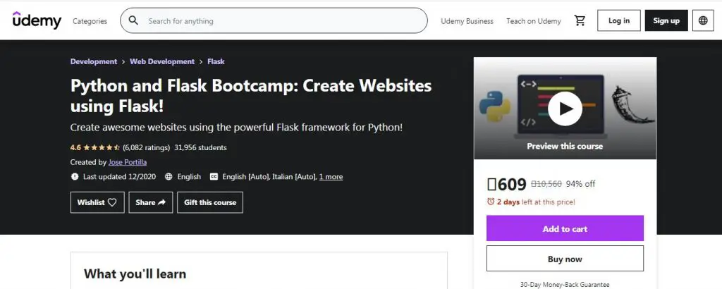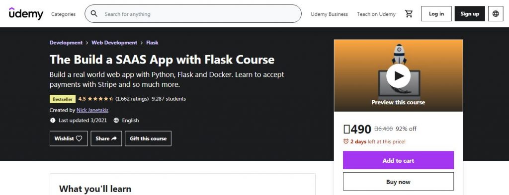 The last course on our list by Udemy (Udemy does have a lot of useful Flask courses so we couldn’t help!) is the best fit for students who already have basic knowledge about Python and Flask, and are now looking for the right course to help them create amazing web applications. Apart from Python and Flask, you will get familiar with Docker and why it is worth using. This course will not only help you successfully develop a web application but also will make you an expert on Flask and Docker.