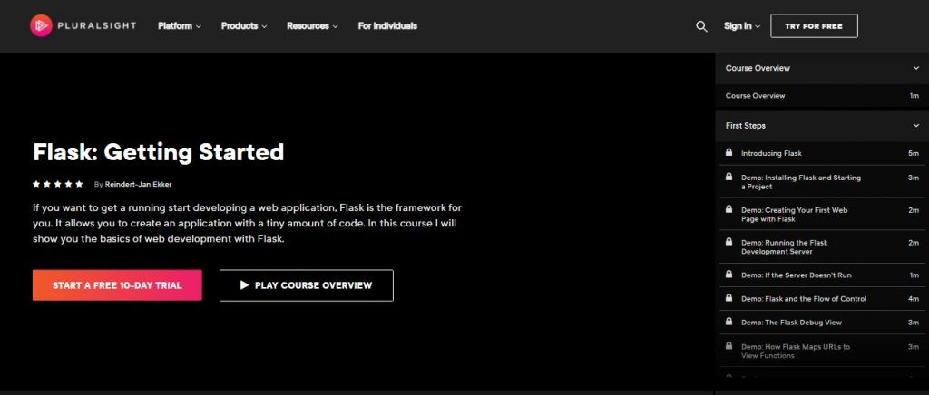 The last course on our list is by Pluralsight that can prove very helpful in getting you started with Flask. This beginner-friendly course is perfectly designed keeping in mind professionals or individuals who want to get their hands on Flask to build web applications. Learn about the basics of web developments using Flask and also learn to work with templates. By the end of this course, you will have complete knowledge of Flask and its functions and will be able to successfully develop web applications.