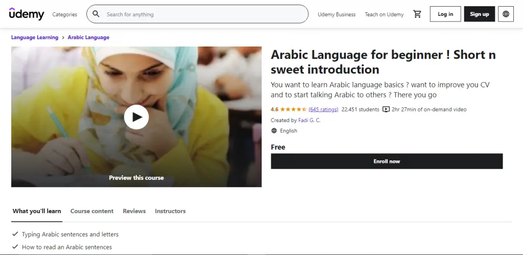 You will take this course to learn Arabic Basics, and what is meant by basics is that you will be ready to read Arabic letters, how to write them, Arabic numbers and how to spell them additionally, close to beginners’ sentences, for example, intro sentences a few words that you need to use for instance in the restaurant, airport, or even in the street, in addition to how to greet yourself to other people. In this course, you will learn for over 130 minutes, more than 60 quizzes in tests including numerous decisions and valid/bogus inquiries. The course will show you how to pronounce letters and join them together to make words, then, at that point, you will attempt to make sentences by yourself.