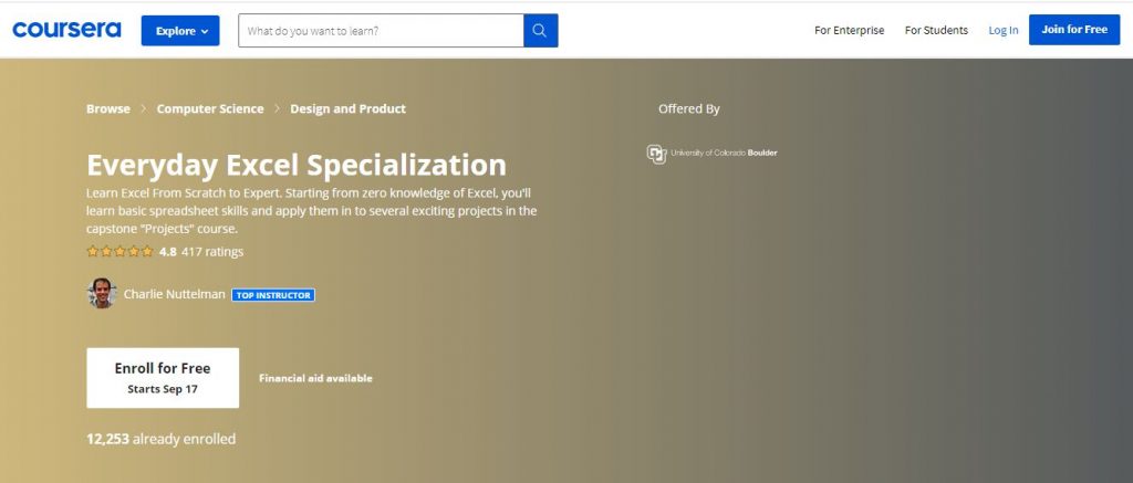 The course by Coursera is specialized to lend the most successful way of leading a learner from zero knowledge to the level of expertise in handling the spreadsheet. The learners are sure to be experts after the course, as they are getting the opportunity to apply the skills to various stimulating projects in the capstone ‘Projects’ course. The tools, techniques, and functions applicable to real-life situations, open-ended projects, navigating the Excel spreadsheet, cell formatting, expression entry, common excel formulae, and data management. There are several tricks and tips that the spreadsheet provides in order to validate data, pivot tables, charts, and much more. Calculations are made easier and help in the analysis using formulas and functions. The course ensures to take the learners from the beginner’s level to expert status in Excel. There are subdivisions of the main course where the topics are categorized, and the final part of it comes with a guided project which emphasizes the dynamic array functions which are innovative areas rather than the normal worksheet calculations.