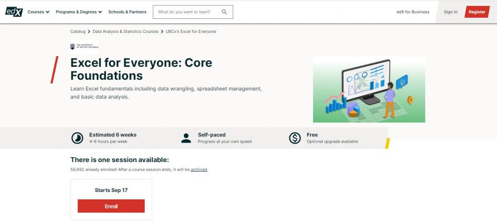 The basics of learning Excel including data wrangling, spreadsheet management, and basic data analysis are the core part of the course. The course promises the learner to arm oneself with the extremely sturdy basic understanding of Excel in order to organize, analyze while handling data. The program can be opted by those who are very less aware of the software or have zero understanding of the same. This can also be a refresher course for those who are using it already to improve their skills further. The promised time period by the providers is six weeks which can make you confident enough to navigate through the interface of Excel, master the techniques essential for the performance in the spreadsheet, and also carry out calculations, creative chart preparation, graphical representation of data, and several other data analyses leading your organization to success. The learners can be confident enough with the fundamentals of Excel, knowledge of editing formats, performing calculations using formulas and functions, optimization of spreadsheets and formatting them, data visualization, and sorting of tabular data are included in the curriculum of study.