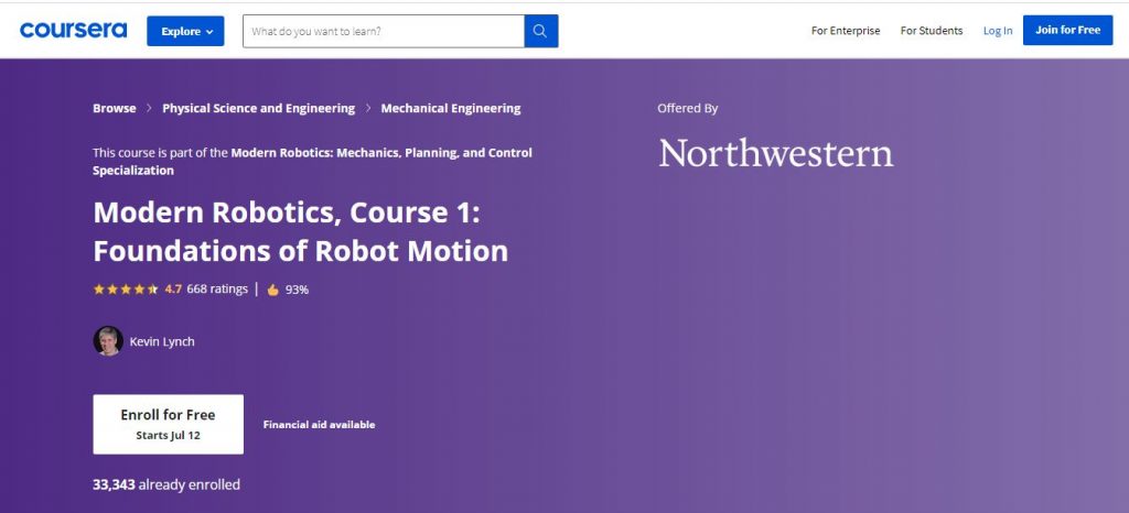 It is intriguing to really understand how robots have the understanding to accept a certain command and act accordingly. This course deals exactly with that. The course lets you understand the basics of the interdependency between the computer and the machine. Fundamentals of Robot configurations and robot mechanisms are learned in this course. This course is a part of a specialization in robotics that you can pursue once you complete this course. The course is offered by Northwestern University on Coursera. The course is presided by Kevin lynch who is a professor in mechanical engineering. You can enroll and audit the course for free on this platform.