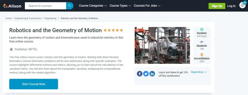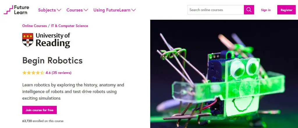 Introduction to everything that has to do with robotics is elaborated in this course. People are interested in the origin of robotics and how the whole scenario led to this industry is one of the leading industries in the world. Well, you can find your answer right here in this course. The basics of robot design, their working, and the science behind that are depicted in this course. Various tasks in the course act as an asset. The course is provided by the University of Reading on FutureLearn. The course is split into 4 weeks to a total study hours tally for 3 hours. You can enroll in this course for free. Engaging educators help the learners feel like they part of the course.