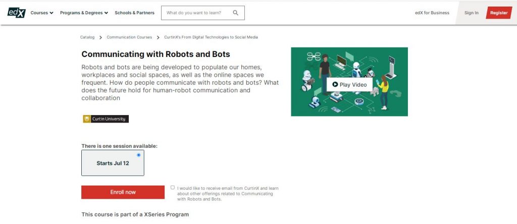 We say that communication is an important part of human life. Without communication, things become difficult. This is also the case with robots. There is no progress if proper communication is not done. You might have seen assistance bots while surfing through a specific website. This course tells us more about the functioning of such robots and bots. It elaborates the communication that has to be established between humans and machines in order to maintain that balance. This course is offered by Curtin University on edX. The course is for 4 weeks with 2-3 hours of study each week. The course is for free but you have to pay for the certificate.