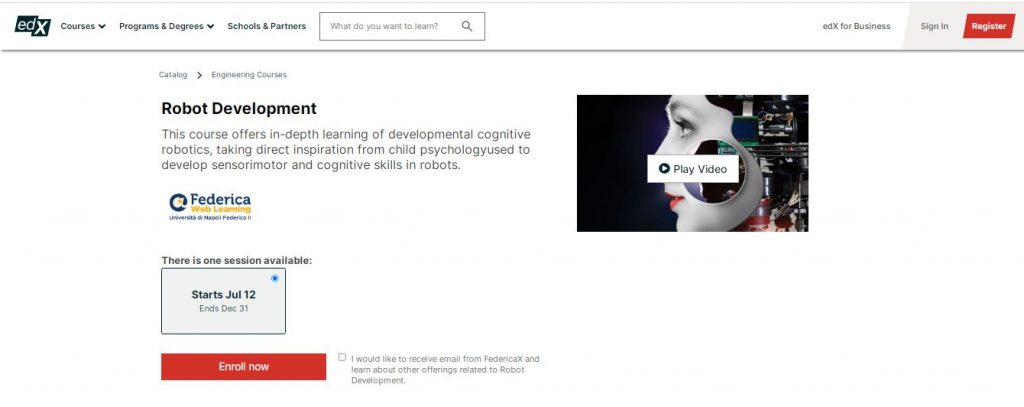 The actual development of robots with the help of cognitive skills is showcased in this course. The course will help one understand how robots are made to understand humans and how they are trying to grasp everything related to humans, the language, the emotion, impulses, and everything related to that. Applications of real-life instances in robotics are shown here. The course is offered by Federica Web Learning on edX. The course is 6 weeks long with 6-7 hours of weekly study. The course can be pursued for free but if you want a certificate you have to pay for it.