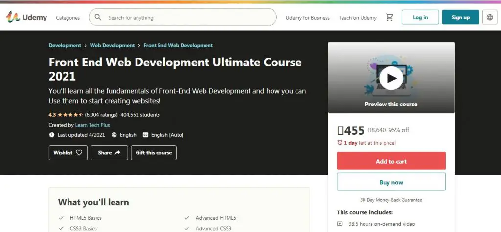 The course is designed for beginners. In this course, you’ll learn everything from web design fundamentals to front-end web development. The course is divided into 30 modules, including 244 lectures. Itequips you to plan, design, and code your self-directed website project, explore modern web-design tools, code websites and applications with HTML5 and CSS3, learn visual design fundamentals from scratch, and code a simple ‘Tip Calculator’ in JavaScript.