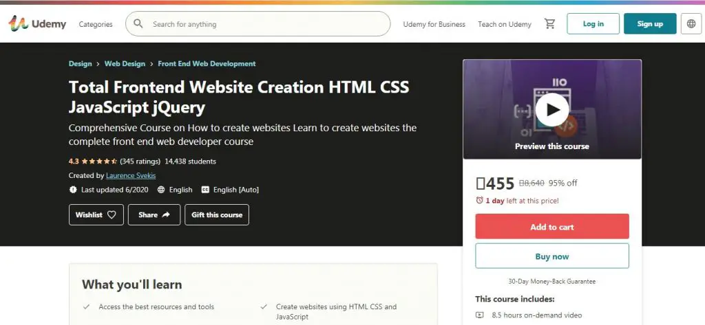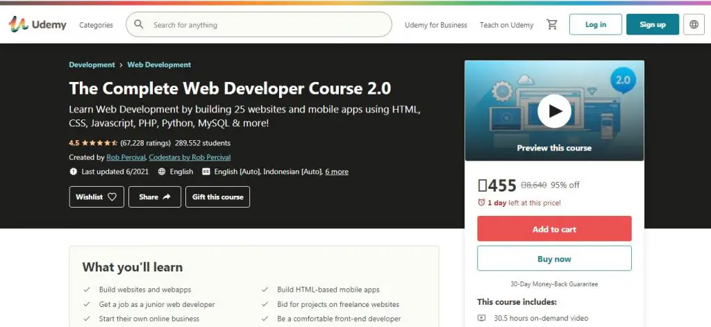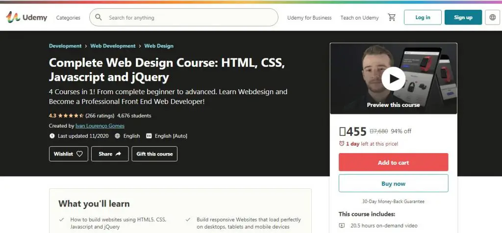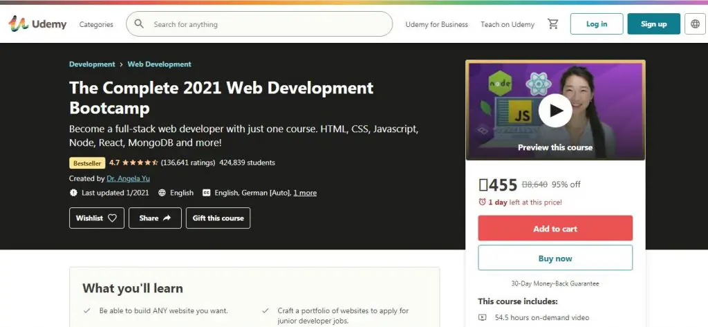 The course is specially designed for beginners. Here, you’ll learn everything about creating a website. If you want to know how website creation works, you should take this course. The most significant advantage of this course is that you can apply to any MNC for a web development job after completing this course. You’ll get 8 hours of on-demand video, 45 articles, and five downloadable resources. The course topic includes the foundation of website creation and development, applying skills to update and create a website, and developing websites using JavaScript, HTML, and CSS. With a rating of 4.2, this is one of the best courses on Udemy.