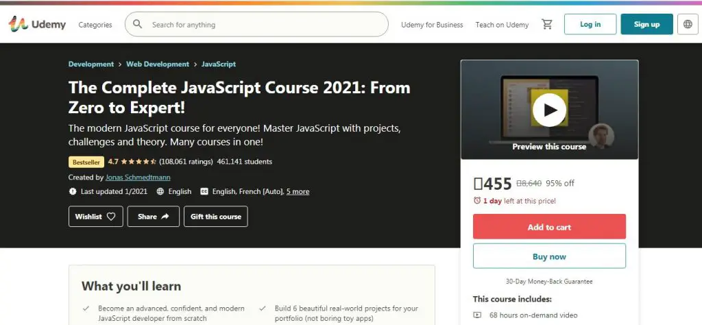 The course entirely focuses on JavaScript, exploring and deepening ultimately, and with over 400,000 students, it is the most bought JavaScript course on Udemy. In this course, you’ll learn everything about the JavaScript language, starting from basics, exploring the variables, the different types of existing data, the control structures, and the cycles. You’ll then continue with object-oriented programming and then move on to creating six projects where JavaScript plays a key role. It will allow you to work with this language on real projects and sites with actual functionality to apply what you have learned in the best possible way.