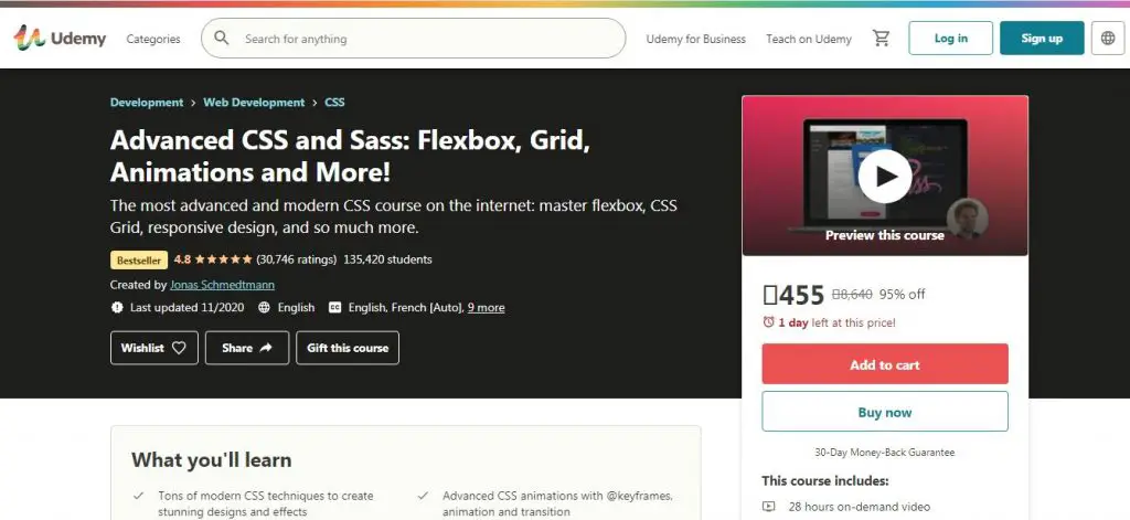 This course is for individuals who knowto code in HTML and CSS. The course will equip you with the real-world techniques used by professionals to build a stunning design. The topics under the study include tons of modern CSS techniques to create unique designs and effects, how CSS works behind the scenes, advanced CSS animations with keyframes, animations, transitions, and advanced responsive designs: media queries, mobile-first vs. desktop-first, etc. With 4.8-start ratings, the course is available in many languages such as German, Thai, Italian, Spanish, Polish, etc.