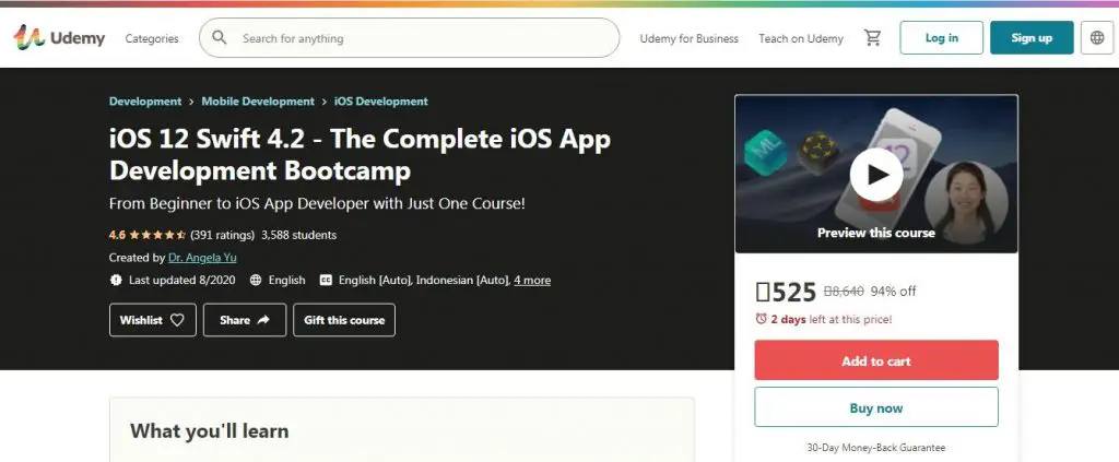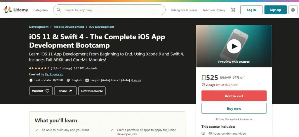 This terrific course that Angela Yu has created will teach you how to develop iOS 11 apps from scratch. XCode 9 and Swift 4 are among the languages she used. Complete ARKit and CoreML Modules are also included in the program. So far, this is the most popular iOS course. The instructor is a skilled iOS and WatchOS developer who is very skilled in Swift and Objective-C. Angela has been programming since she was 12 years old, and through the years, she has produced over 70 applications and games. Her classes are in high demand because of the fun yet intelligent personality, and quickness with which she responds to the students’ questions. This is without a doubt the best iOS programming course accessible on the internet. This amazing course is available in multiple languages including Japanese, Spanish, Italian and Turkish. What is even more amazing about this is that you can begin this course even if you have zero knowledge about programming.