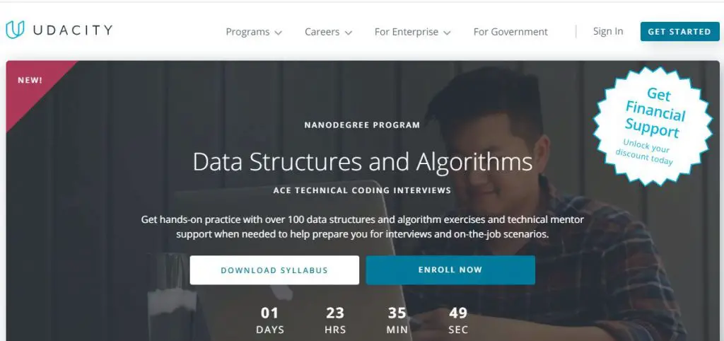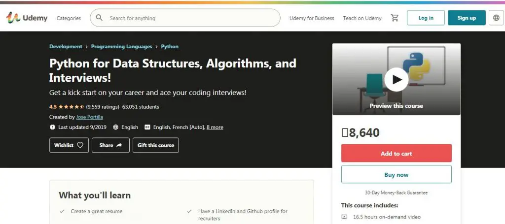 This Udemy data structures and algorithms course is taught by Jose Portilla, who has instructed many students about Python programming and Data Science. He has made this course to assist individuals with the coding interview process at the top technology organizations. It is essentially a three-in-one course covering data structures and algorithms in Python and technical coding questions alongside answers for them and non-technical interview preparation like resume reviews and in-person interview prep. The course content is spread over 200+ video lectures that clarify a specific topic, joined by a journal of composing code and explanations in a time of around 16.5 hours. Moreover, the course incorporates mock interviews to equip the students better and accompanies a 30 days money-back guarantee.