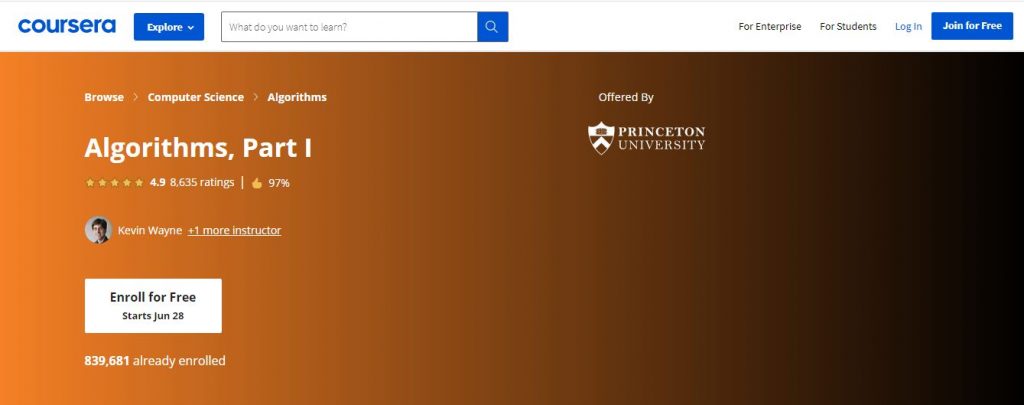This is a two-section course arrangement on algorithms offered for free by Princeton University. The students have welcomed both the courses, making them one of the highest-ranked algorithms seminars on Coursera with a rating of 4.9 out of 5. The classes give a prologue to algorithms and data structures, emphasizing applications and scientific execution analysis of Java implementation. Although the ideas are language autonomous, the arrangements and executions are made in Java. The first section of the course name, Algorithms, Part 1, covers elementary data structures and sorting & searching algorithms. Section 2, namely, Algorithms, Part 2, revolves around the graph and string-processing algorithms and more advanced concepts used in application development. This is a six-week course including 8-10 hours of sessions per week.