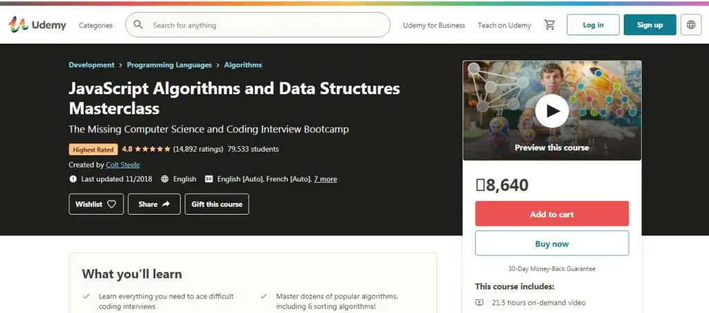 This class on algorithms and data structures in JavaScript by Colt Steele is among the most highly rated and reviewed courses on Udemy. Whether hoping to ace a coding meeting or come out better as a developer or improve one’s critical thinking abilities, this course ends up being a great fit as it centers around building a complete computer science foundation to solve any computational problem. The program packs a month of computer science and interview prep material into 22 hours of video exercises. The course begins with the basics and gradually covers progressed themes like Heaps, Graphs, etc. It is an interactive course with more than 85 coding practices where students are relied upon to evaluate each issue all alone before the teacher walks them through solution choices. Aside from video lectures, it incorporates 32 articles and 80 downloadable resources.