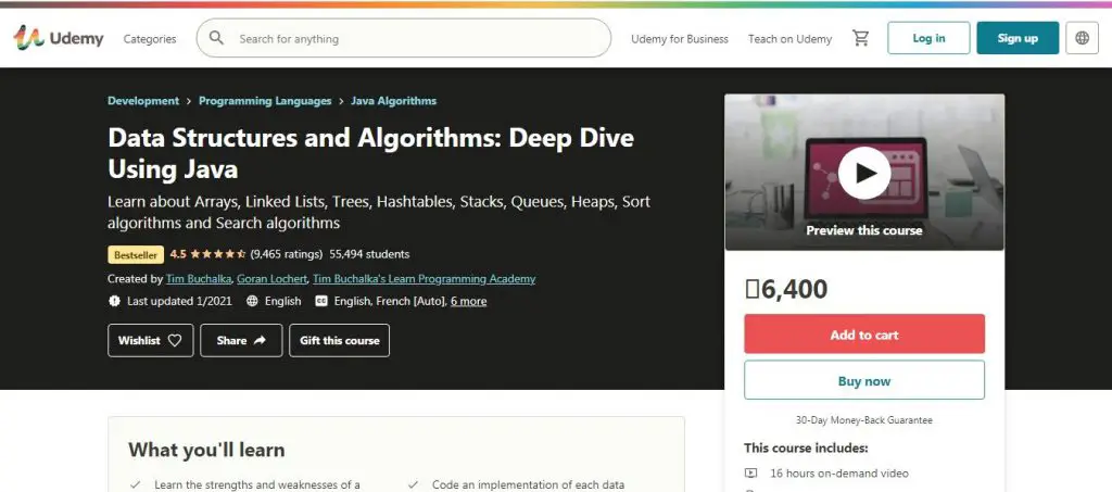 This is one of the most extensive courses on data structures and algorithms utilizing Java. It gives an excellent and direct manual for the implementation of the most up-to-date algorithms from grassroots: arrays, linked lists, graph algorithms, and sorting, etc. You will also learn about binary trees, balanced trees like AVL trees and Red-black trees, piles including heapsort algorithm, associative arrays, and word references. Additionally, you’ll learn the strengths and weaknesses of different data structures and will be equipped to choose the best data structures for your application. If you are a Java developer searching for an excellent data structure and algorithm course, you should join it. It’s comprehensive and yet, both energizing and testing.