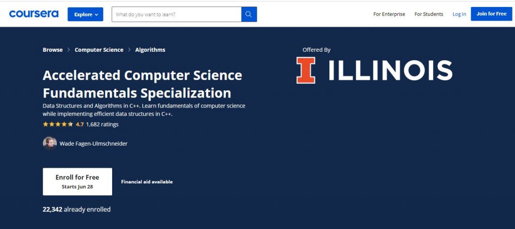 This Coursera Specialization from the University of Illinois teaches fundamental computer science algorithms and data structures. It is a complete program created by C.S. Professor Wade Fagen-Ulmschneider to give students a performance pathway into P.C.s and Data Science. The program is full of coding challenges that require students to compose C++ code parts in an electronic interface. Each course incorporates two projects where students execute C++ projects to perform errands like altering pictures, proficiently controlling data constructions, or taking care of a graph search issue. The Department of Computer Science at Illinois University is reliably positioned as one of the top Computer Science Programs on the planet. This specialization helps planned candidates of the Online Master of Computer Science (MCS), and MCS in Data Science get ready for the Online MCS Entrance Exam. Students of this specialization acquire the essential capabilities in object-situated programming, Algorithms, and Data Structures to be prepared for cutting-edge study in graduate-level C.S. coursework at the University of Illinois and improve their application for confirmation.
