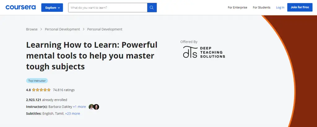 A course presented by DeepTeachingSolutions in Coursera that will let you explore the most invaluable techniques of learning. These memory and learning techniques can be applied in any discipline, and can help you with memorizing even the toughest subjects.