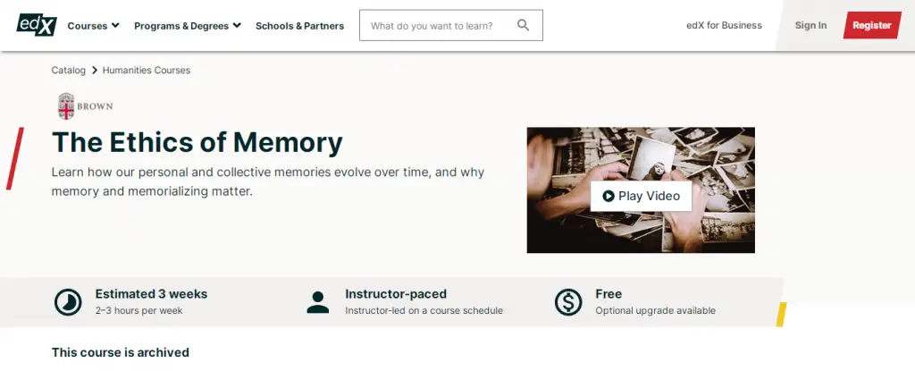 Next on our list comes a free course on edX provided by BrownUniversitythat will focus on the Ethics of Memory, and let you explore all the dimensions of it. From understanding memory from the core to exploring its various types, there is a lot of interesting facts to learn in this course, and by the end, you will have a comprehensive understanding of memory and its impact on our everyday lives.