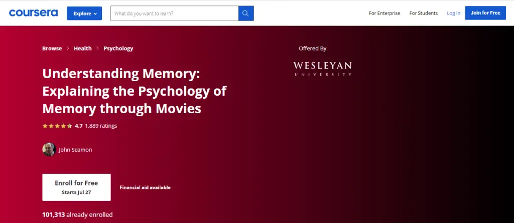 Wesleyan University’s UnderstandingMemorycourse is going to be an absolute fun learning experience since it will present major concepts and ideas tostudents through movies. This course is basically for those students who are curious about the science/psychology behind memories, and want to dive in deeper to understand it comprehensively.