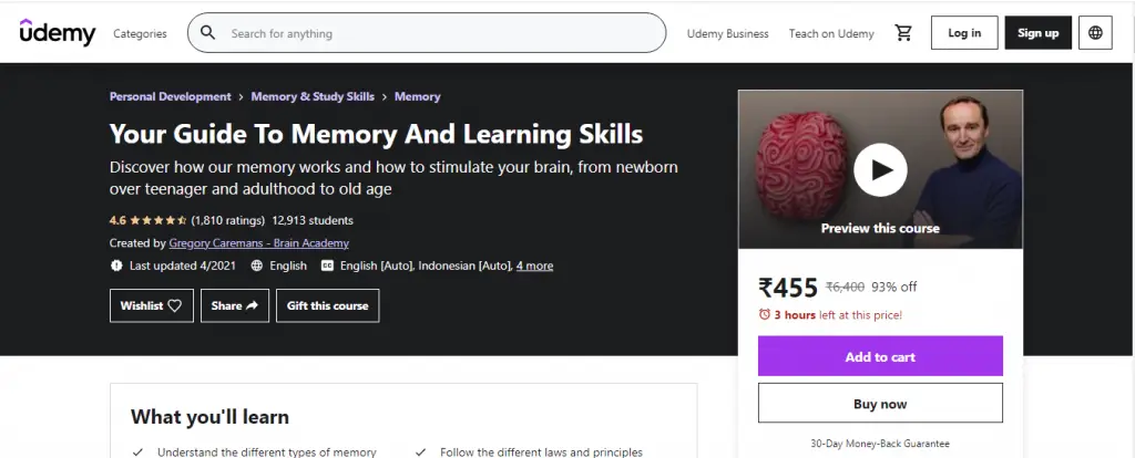 This course on our list by Udemy is the ultimate guide to enhance your memory and learning skills. A course ideal for students who are looking for opportunities to develop learning and memorizing skills, this course will help them overcome their difficulties and bring improvement.