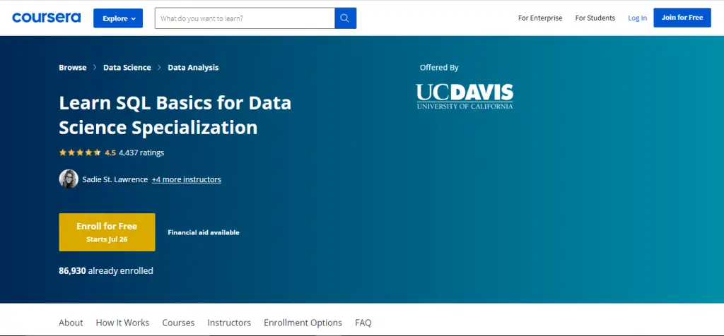 1. Learn SQL Basics for Data Science Specialization by University of California on Coursera