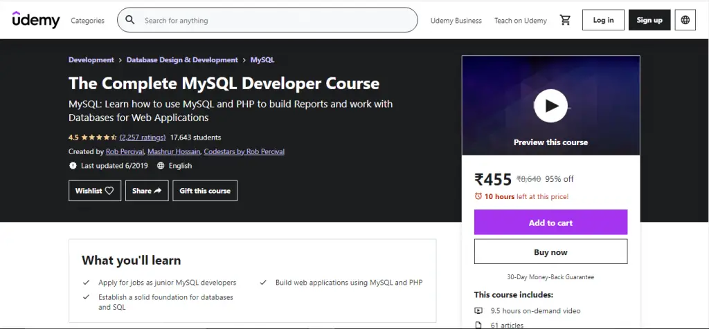 The program delivered through Udemy has been used for the understanding of MySQL and PHP to work with databases used for web applications. The medium of language is English, so it is suitable for learners in the United States. It ensures the learning being acquired in 4 weeks. It is found to be suitable for those who are generally interested in MySQL and Database expertise, for those who would like to pursue a career as a developer of MySQL, or for those who are preparing to shift the career to the Technology sector. The course is very much suitable for building a strong foundation in the development of databases by using MySQL, developing applications using PHP, HTML, and CSS, and a complete quality-assuring team for constant support. The development of basic development skills surely goes on par with the fundamentals of MySQL. The understanding of database development is one of the most essential skills to be acquired for working with MySQL. All this ensures surety in the work and building of applications where MySQL is the base.