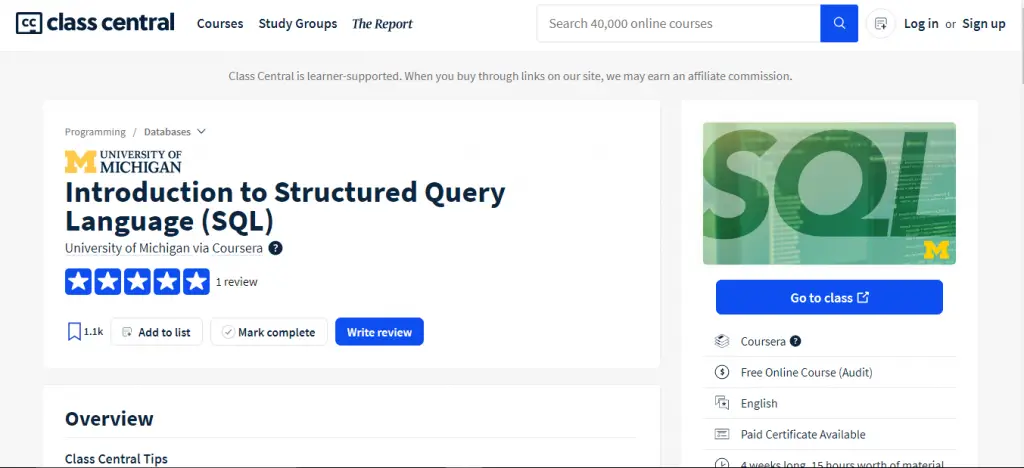 3. Introduction to Structured Query Language (SQL) by the University of Michigan via Coursera