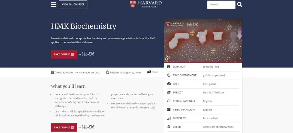 Another online course on our list by Harvard University relates to the fields of health and medicine. The HMX Fundamentals of Biochemistry is not free of cost like the previous course on our list, the course fee is $800, and its duration is 10 weeks. This program is provided by the HMX from Harvard Medical School, and a certificate can be obtained after the successful completion of the course.