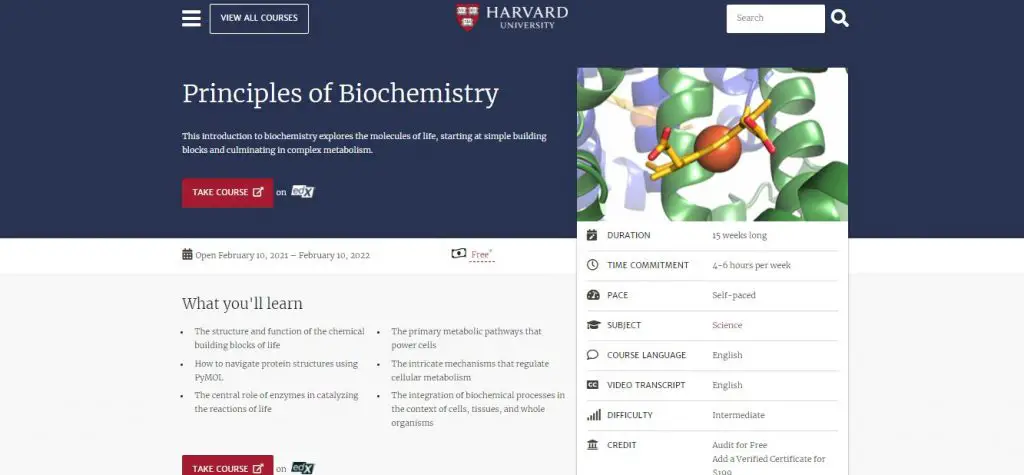 An online course on Principles of Biochemistry provided by the prestigious Harvard University is totally free of cost and is accessible for all. This 15 week-long course is all you need to master the field of Biochemistry. From basics to exploring the molecules of life, this course will cover vital areas of molecular biology and chemistry.