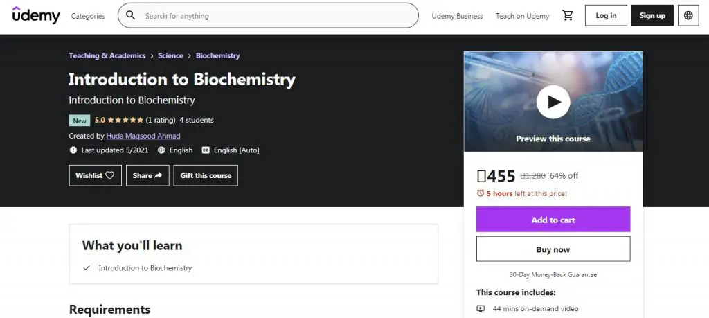 For the beginners of Biochemistry, Udemy has the right course to begin in just the right way. From basics to exploring the fundamental areas of Biochemistry, this course is a one-stop for all. Here, you will learn about carbohydrates, proteins, lipids, and nucleic acids that are the integral parts of biochemistry, and every student wanting to pursue their career in the desired field must know about them. This beginner to the intermediate level course has a short duration of 44 mins, but don’t judge it by its duration, because it features useful information and a right Introduction for the students who want to begin with Biochemistry.