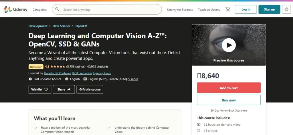 This certification course offered by Udemy has a rating of 4.4 out of five. This course will help you have a toolbox of the most powerful Computer Vision models. This course will enhance your understanding of the theory behind Computer Vision. This course will guide you to master OpenCV, master Object Detection and master Facial Recognition. This course will make you able to create powerful Computer Vision applications. This course covers face detection intuition, face detection with Open CV, homework challenges, object detection intuition, object detection with SSD, generative adversarial networks (GANs) Intuition, image creation with GANs and Artificial Neural Networks. The key features of the course include: