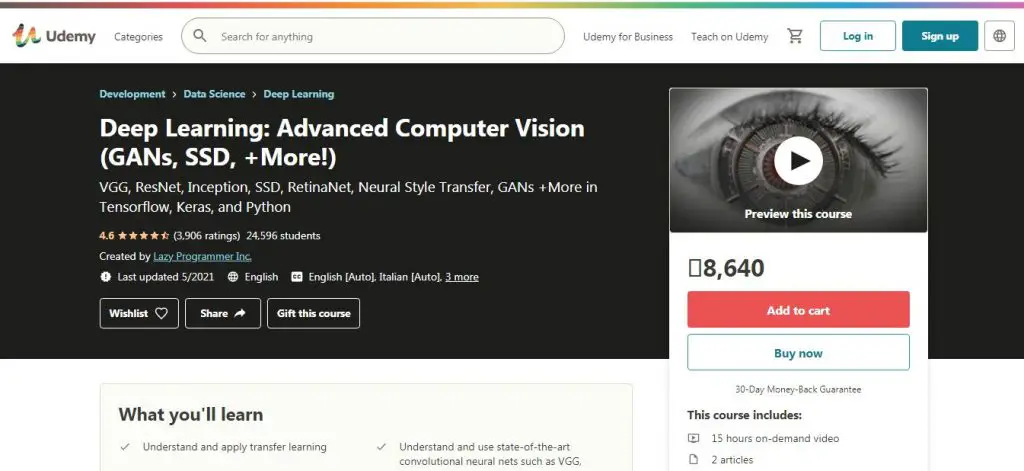 This is a certification course of rating 4.5. This course cover Machine Learning Basics, Artificial Neural Networks (ANN), Convolutional Neural Networks (CNN), VGG and Transfer Learning, ResNet (and Inception), Object Detection (SSD / RetinaNet), Neural Style Transfer, Class Activation Maps, and GANs (Generative Adversarial Networks) and much more. The key features of the course are: