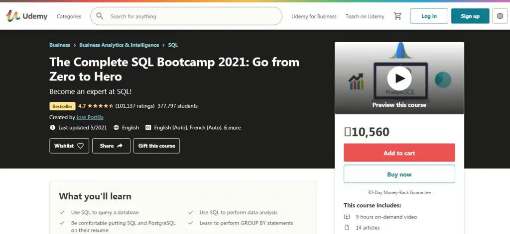 - SQL Basics: This is for beginners in which you’ll learn about databases, SQL queries and tables, aggregation and basic SQL syntax. You are provided with quizzes and tests to test your progress throughout the course. This is available for only $39.
