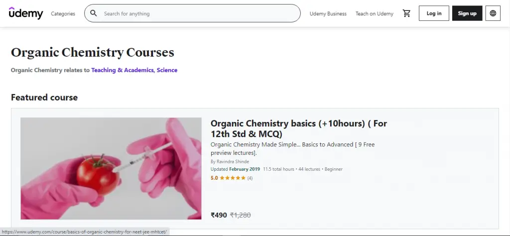 On Udemy, there is an extensive list of organic chemistry programs. You can look via the programs and choose the one that best suits your learning needs. The programs offer a wide range of subjects and topics for students of various levels. Understand the fundamentals of organic chemistry, including the constitution of chemical molecules, their interactions, and chemical synthesis. The classes are aimed at people who want to study chemistry for a profession, parents who are home-schooling their children, and specialists who want to improve their knowledge and skills. The syllabus will help you to understand the fundamental and advanced concepts of organic chemistry to advance in your career. You will also get certified by Udemy to add to your portfolio after successful completion of the course. You will also learn through interactive videos and course material given for practice.
