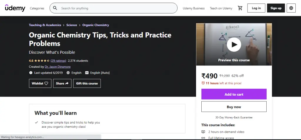 This course is basically an essential guide for you to step into the world of organic chemistry. The course covers all the fundamentals of organic chemistry from the structure of an atom to more complex topics like reaction mechanisms and isomerism. You will be able to distinguish between molecular formulae and structural formulae after this course. You will be provided with 2 articles and 6 hours of on-demand videos and also 1 downloadable resource. You will also receive a certificate of completion after successful completion of the course. Once you buy the course, you will also get lifetime access.