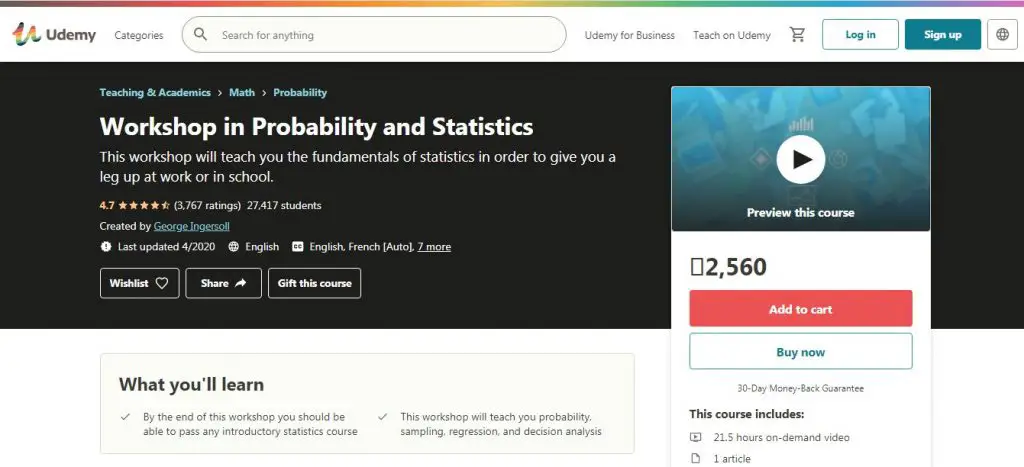 This course offered by Udemy is the best beginner-friendly course to understand the functions of Probability and Statistics in the world of Data Science. This course will introduce you to the basic functions of probability and statistics, and help you completely understand their roles in data analyzing. This simplified course is appropriate for students and individuals who want to completely understand the concepts and expand their knowledge. This course is also appropriate for business professionals who want to have a better grasp of probability and statistics to expand or benefit their business or career. This workshop is available at a nominal amount and its duration is 21 hours.