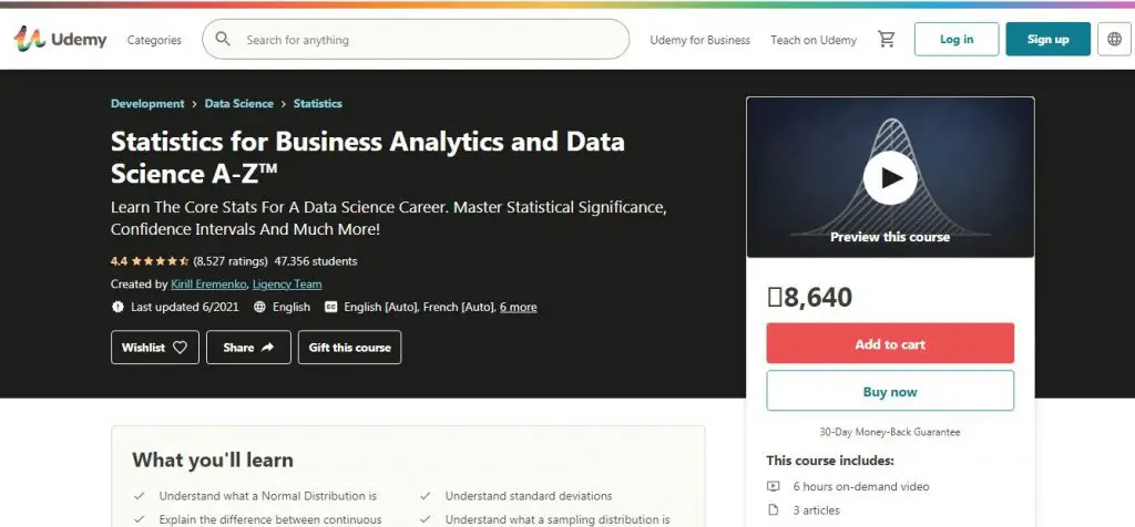 Another top-rated course available in Udemy, Statistics Course for Business Analytics is ideal for individuals who want to proceed with their career in Data Science. This course contains A-Z that is everything you need to know about Statistics and its functional areas that is needed for the profession of Data Scientist or Business Analyst in business organisations. This course will help you master topics such as distributions, the z-test, the Central Limit Theorem, hypothesis testing, confidence intervals, statistical significance and many more things that would make you an expert in the field.