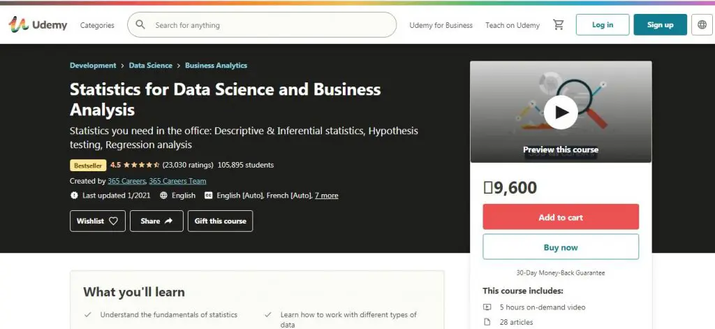 The last course on our list by Udemy is another beginner-friendly course that is designed to help you understand the concepts and functions of Statistics involved in Data Science and Business Analysis. The course will focus on the fundamentals of statistics and will help you learn how to work with different types of data. You will also understand the concepts of Data Science and learn how to use Python and R as programming languages. This easy to understand course is ideal for individuals seeking career opportunities in the field of Data Science, Business Analysts, or who want to work as Business Intelligence Analysts.