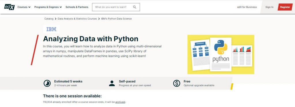 This comprehensive program discusses how Python can be useful in analyzing data and using it to solve real-world problems. Work with multiple NumPy case layouts and use DataFrames on pandas. Along with this, you will have the opportunity to work on machine learning and use different libraries and tools. By the end of the course, you will have a solid foundation and will be ready to go on to earn a master’s degree. The course takes an estimated 5 weeks to complete with 2-4 hours of classes per week. But the course is totally self-paced and the basic version of the course is free. But you also get to select an upgraded version that is paid. The course also teaches students to use the SciPy library of mathematical routines and perform machine learning using scikit-learn. Also, learners who successfully complete this IBM course can earn a skill badge.