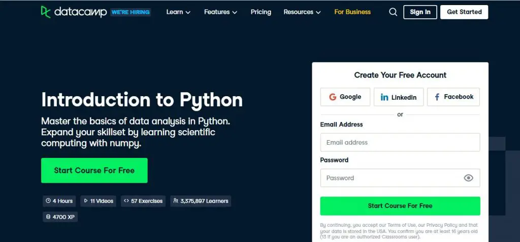 Data camp is the most popular online learning platform for computer engineers and IT professionals. They are especially known for their computer language courses. The introduction to python is a course for beginners who are just getting familiar with the programming language. The curriculum helps you to master all the basic skillsets of data analysis in Python. The course also teaches scientific computing with NumPy. The course starts out with the foundation concepts of the language and then progressing to lists, tuples, functions, methods along with other sub-sections. You will also be working with larger datasets that replicate real-life scenarios. The course features interactive lessons taught by experienced faculty which makes it easy and fun to learn. Also, the first module of the class can be accessed for free to make sure that the course is for you. In total, the course contains 11 videos and 57 exercises for you to complete.