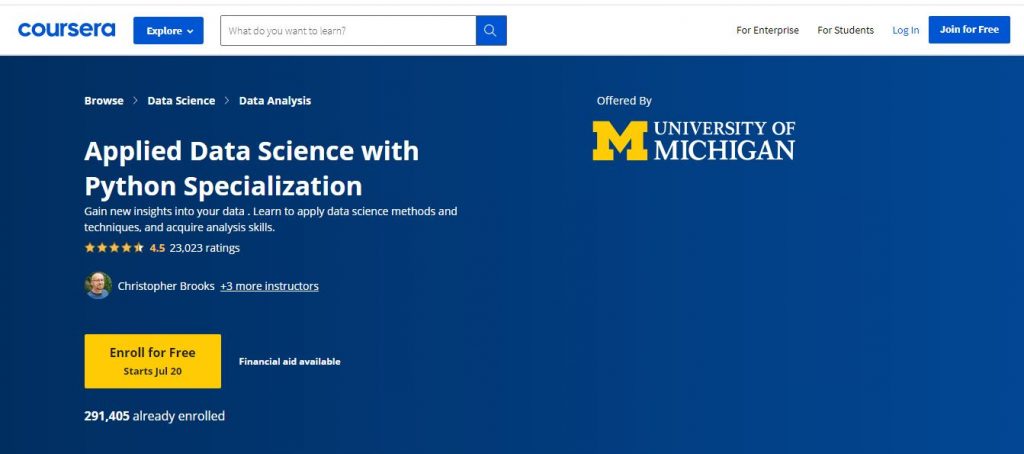 With almost 3 lakh students enrolling, this is one of the most popular courses on Coursera, and rightly so. This course provides you with all the tips and tricks required to master the use of Python in data analysis. The course is also offered by the prestigious University of Michigan which makes it even better. Through the syllabus, you will learn to decide whether a specific data visualization is good or bad and also to analyze the connectivity of a social network. Text Mining, Python Programming, Numpy, Machine learning, etc are some of the important skills that you will learn after completion of this course. The course is taught 100 percent online which means that you can schedule deadlines according to your convenience. The website also rewards students with a shareable online certificate after successful completion of the course. This is not a beginner-level course though and you will need some experience with python and data analysis to properly understand the course material. Even though the class is taught in English, subtitles in a variety of different languages are provided.