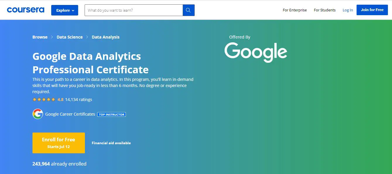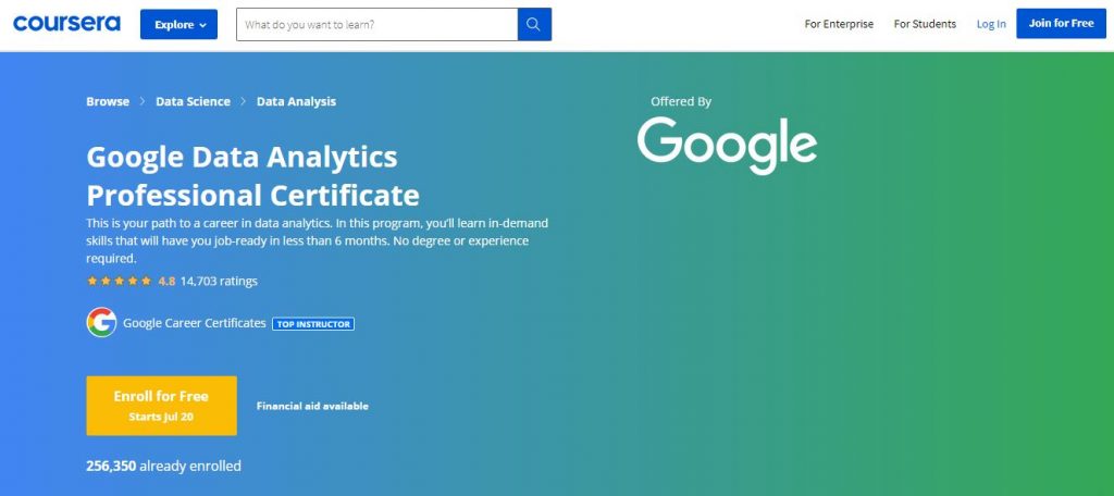 The last course on our list is again by the expert Google, which will teach how to analyze data using R programming. The course is a part of the Google Data Analytics Professional Certificate program and will help learners apply for introductory-level data analyst jobs.